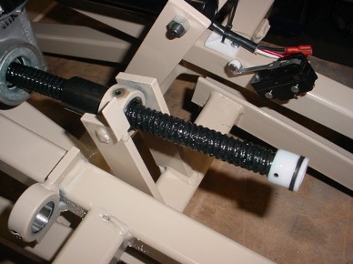 Note: The white plastic cap on the end of the screw is secured with a roll pin that is tapped into place. The white cap is not necessary for this application but the roll pin needs to be there to stop the ball nut at the end of the stroke.