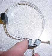 1. Remove the black plastic cap from the screw and then screw from the cylinder clamp. The cap will not be reused. Wrap the strap around the cylinder and slide the small plastic block over the hole so that when the plastic block is secured, the clamp will be snug enough to retain the reed swtich at the desired location on the cylinder.