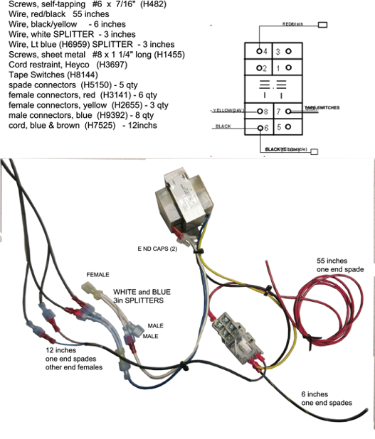 6. BLUE WIRE SPLITTER – The two tape switch wires not connected to the relay will join the blue male connectors of the blue splitter. The yellow female connector of the splitter connects to blue wire from the transformer.