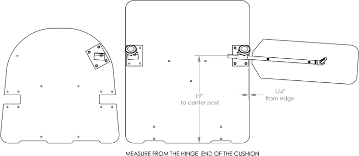 Two versions of cushion are shown for plate orientation. The 19″ dimension is to the pivot stud.