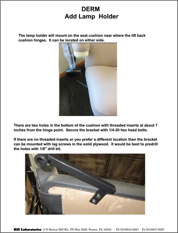 < Help Center Home Home Product Support HA90D Dermatology How to Add a Lamp Holder to a Dermatology Chair Print How to Add a Lamp Holder to a Dermatology Chair