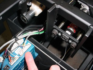 The red and black wires are connected to the terminal block under the chest area. The photo shows the plastic panels that need to be removed to access the terminal block.