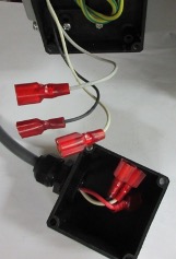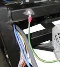 7. Loosen the cord restraint on the junction box and insert the two blue wires from the rectifier. Strip and crimp connectors to these wires as well as the blue on the new motor. Connect the wires in the junction box. Scrape paint and secure the ground wire to frame. Close up the junction box.