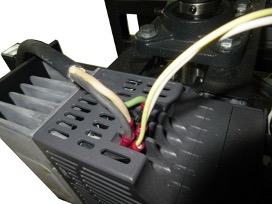 6. Mount the Rectifier close to the drive as shown so the two blue wires can reach the drive. Connect the blue wires form the rectifier to the drive where shown. The red and black wires from the rectifier need to be lengthened in order to connect to the blue wires of the motor. The white and yellow rectifier wires connect to the input terminals on top of the drive.
