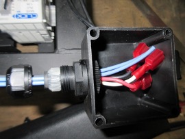7. Loosen the cord restraint on the junction box and insert the two blue wires from the rectifier. Strip and crimp connectors to these wires as well as the blue on the new motor. Connect the wires in the junction box. Scrape paint and secure the ground wire to frame. Close up the junction box.
